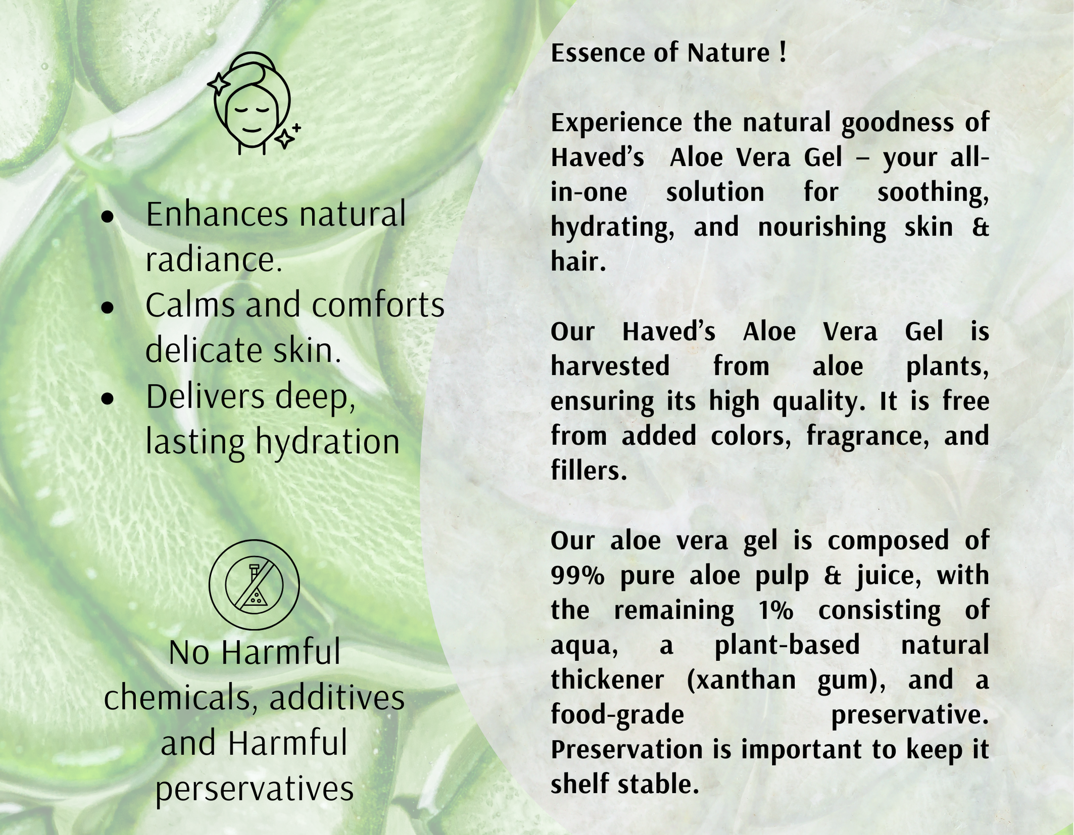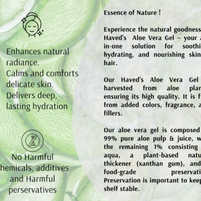 Experience clean and natural hydration with our Pure Aloe Vera Gel, crafted to soothe, moisturize, and rejuvenate skin from the first use. Its lightweight and non-sticky texture absorbs quickly, delivering instant cooling comfort and long-lasting nourishment.