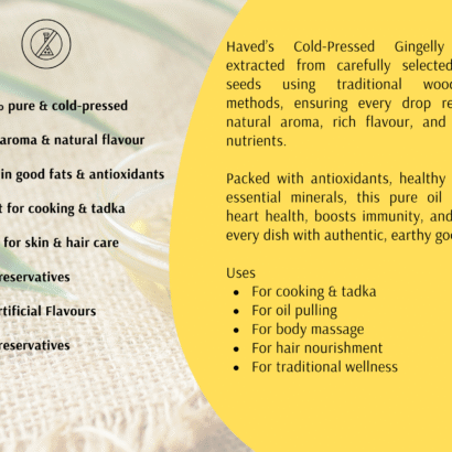 Perfect for everyday Indian cooking, it enhances meals with a rich, nutty aroma while supporting heart health, digestion, and overall wellness. Beyond the kitchen, it is widely valued in Ayurveda for massage, joint care, oil pulling, skincare, and holistic rejuvenation.