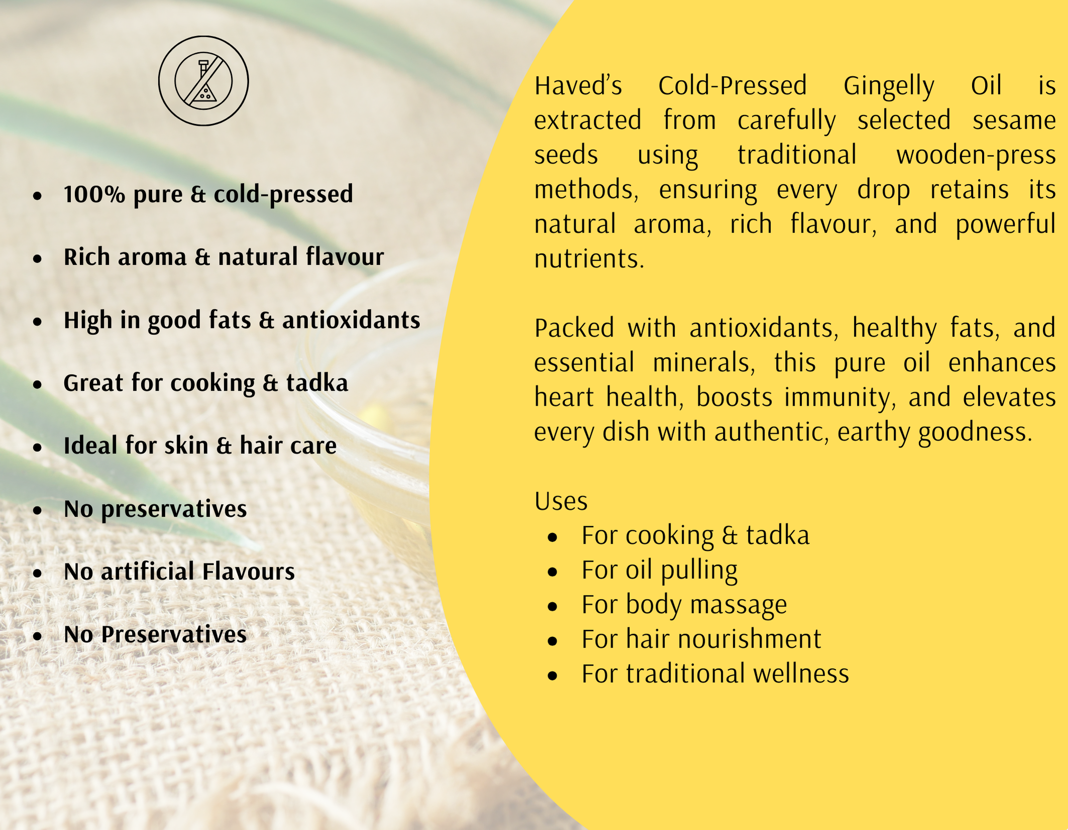 Experience the purity of traditionally crafted Cold Pressed Sesame Oil, extracted using a wooden ghani to preserve natural antioxidants, minerals, and healthy fats. Unrefined and chemical-free, this golden oil offers authentic flavor and therapeutic benefits—just as nature intended.
