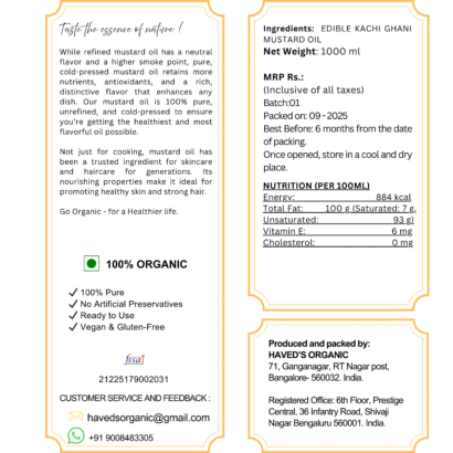 Experience the authentic taste and aroma of purity with our Cold Pressed Kachi Ghani Mustard Oil. Extracted using the traditional wooden “Ghani” method, this oil retains all the natural nutrients, antioxidants, and pungent flavor of mustard seeds.