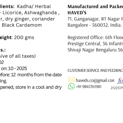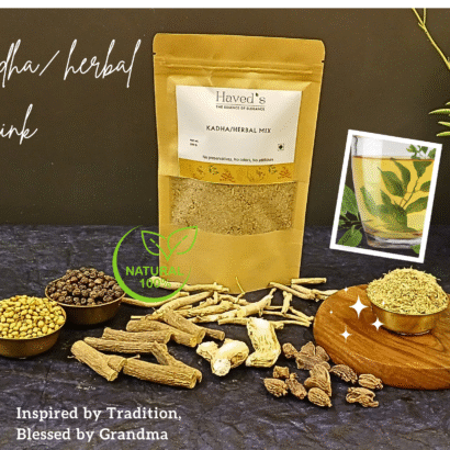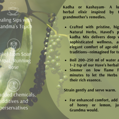 Rooted in the wisdom of Ayurveda and the loving care of Indian kitchens, this Kadha is crafted by my grandmother since ages —pure, simple, and deeply healing. Made from a traditional blend of Ashwagandha, Adhimadhuram, Dry Ginger, Black Cardamom, Coriander Seeds, it supports immunity, digestion, respiratory health, and natural healing from within.