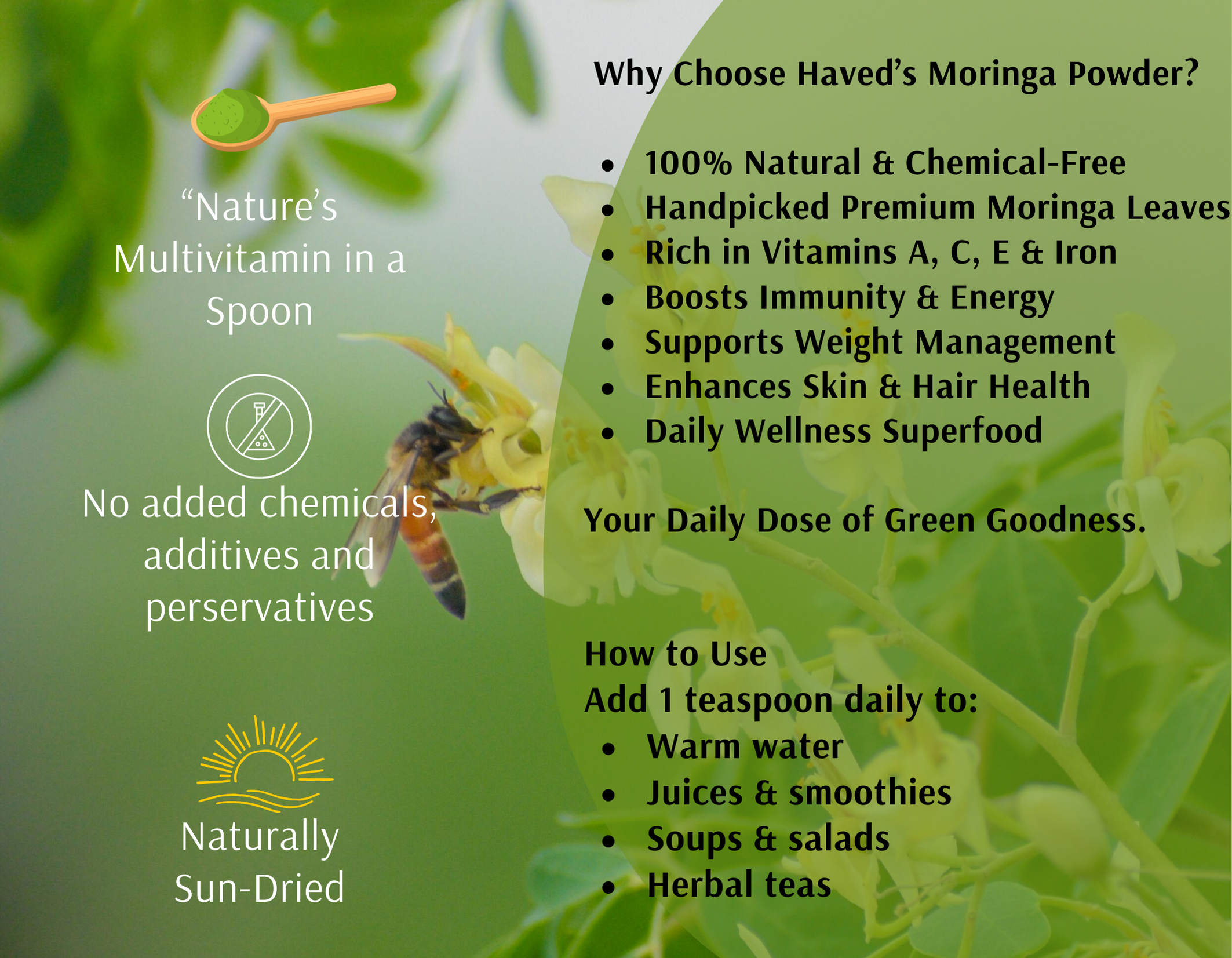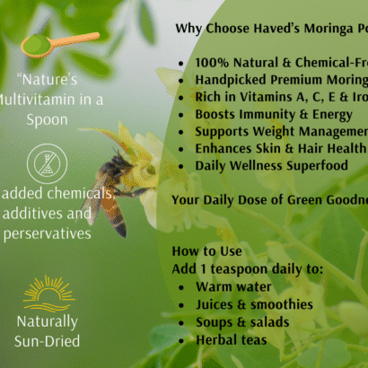Rich in iron, calcium, plant protein, and active compounds, moringa helps boost immunity, balance metabolism, improve digestion, and support everyday vitality. With its clean taste and versatile use, it blends beautifully into smoothies, teas, soups, and wellness drinks, making it a simple and natural way to elevate your daily diet.